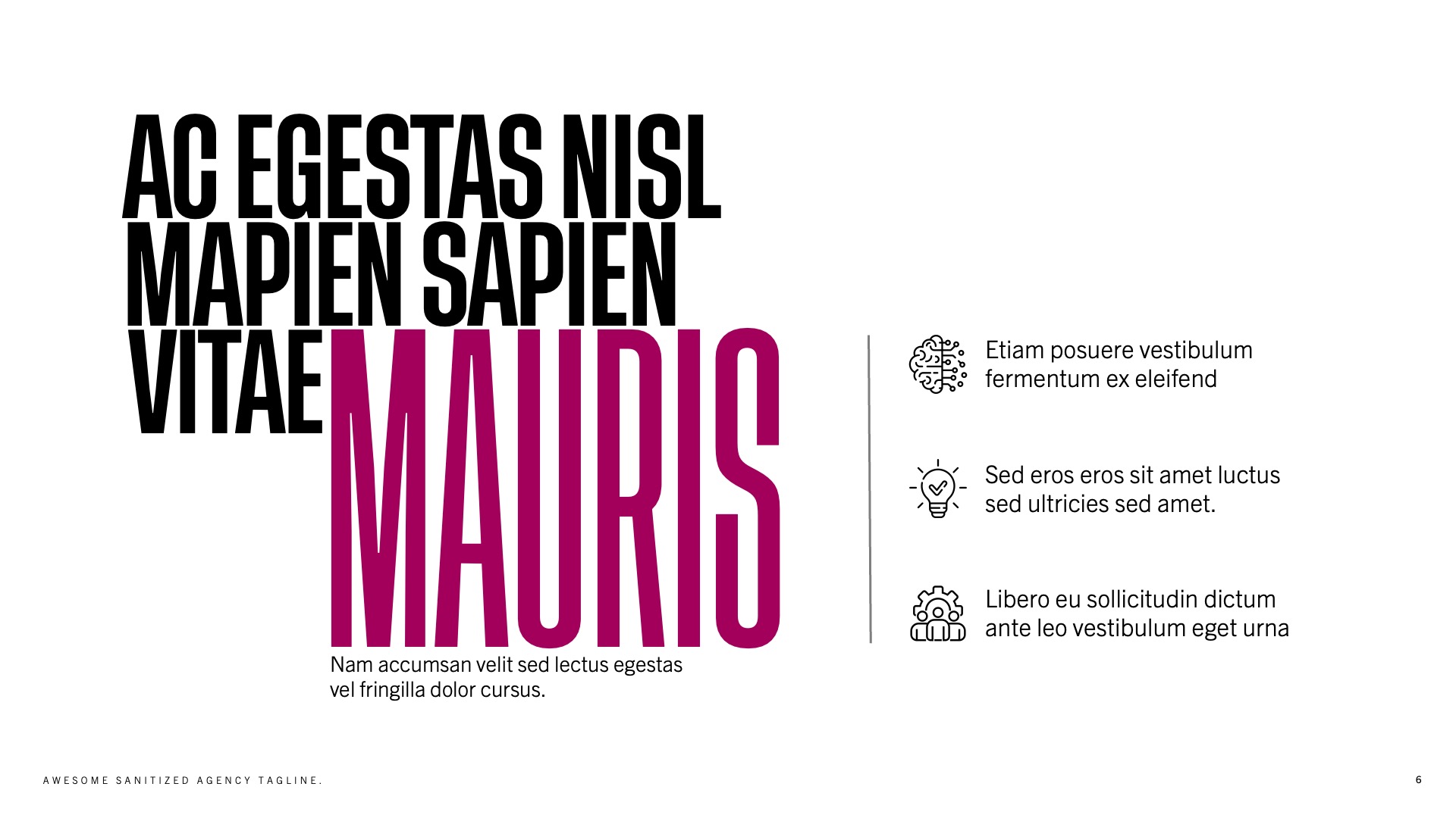 Great decks aren’t built from complexity; they’re carved out of it. A simple story with nothing extra means putting the audience at the center of your story. Don’t focus on everything you want to say; focus on what they need to hear. This applies to design as well. Stripping everything down to block color, iconic silhouettes, and razor-sharp type isn’t an aesthetic choice; it’s a strategic one. Show them what they need to see. Subtract everything else. All slides sanitized for confidentiality.